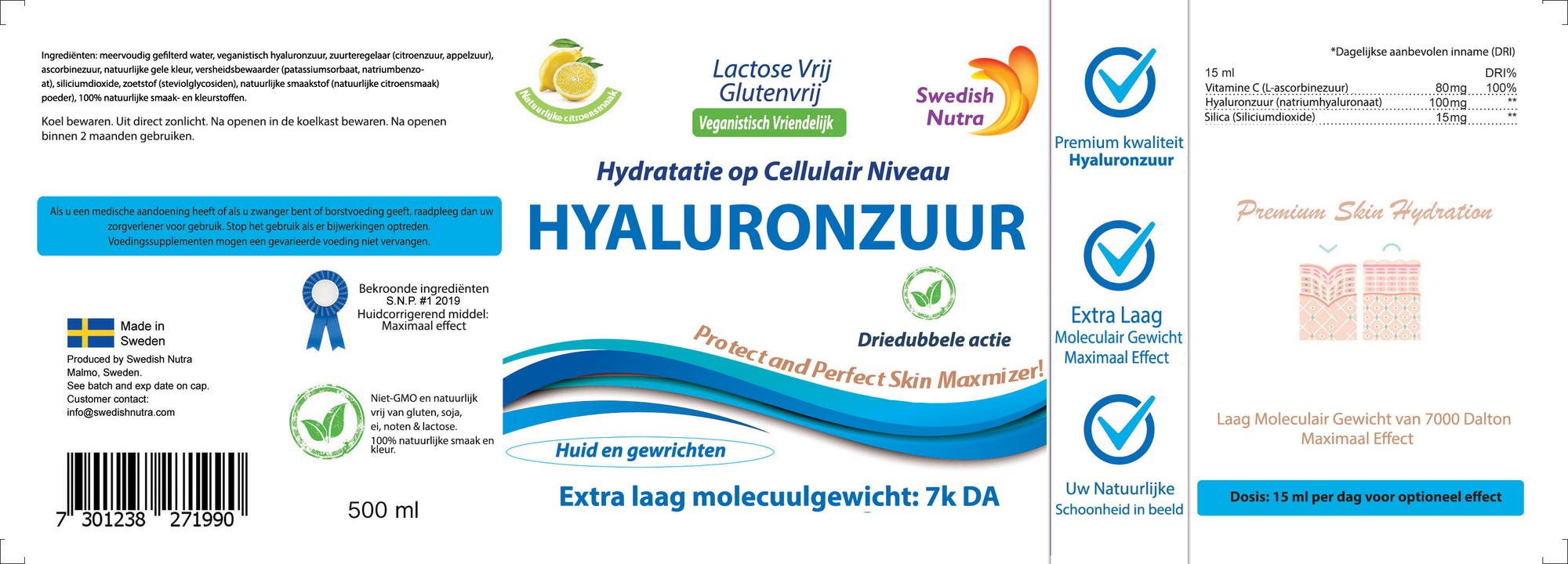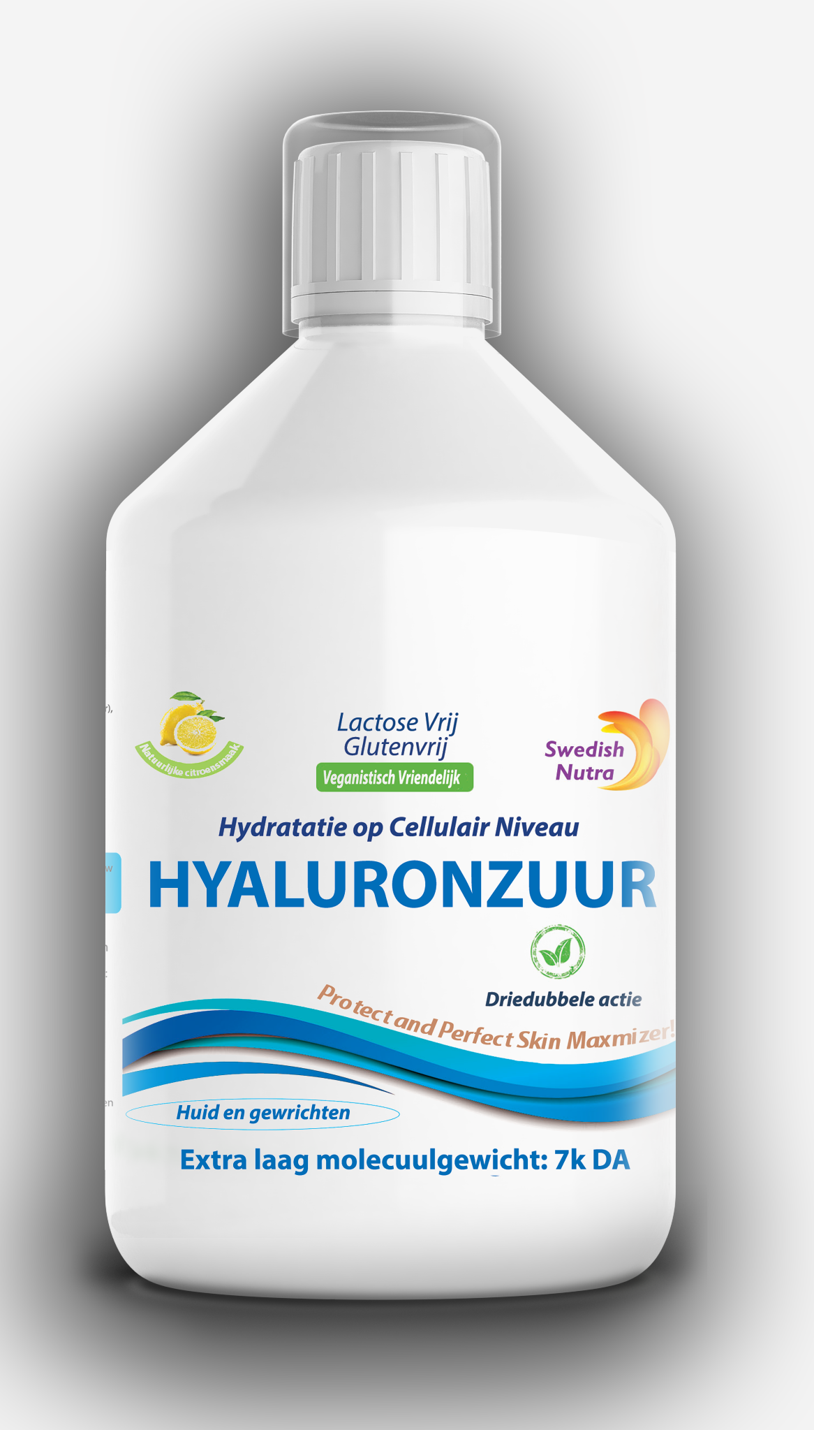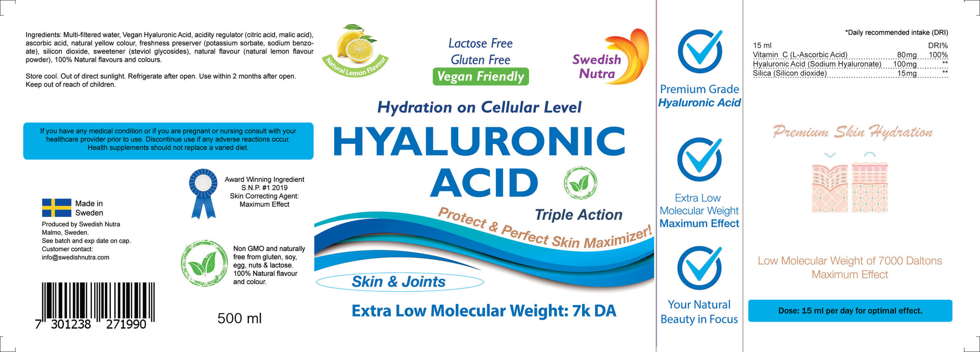 Swedish Nutra’s Hyaluronic Acid is a delicious lemon-flavored liquid supplement that contains a natural formula of hydrating nutrients. Glow from inside and out. Hyaluronic Acid is naturally produced in the body, mainly occurring in the skin, connective tissues, and eyes. It has a unique capability to hold onto weight in moisture, keeping tissues well lubricated and moist. Our Hyaluronic Acid 500 ml provides a 33-day supply of a powerful formula that hydrates the skin on a cellular level, all in only 15 ml.